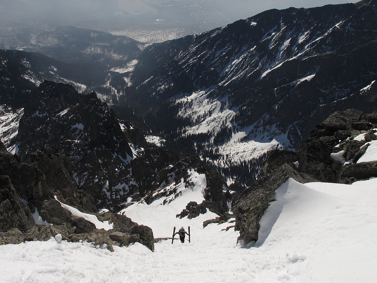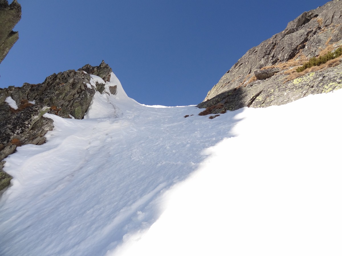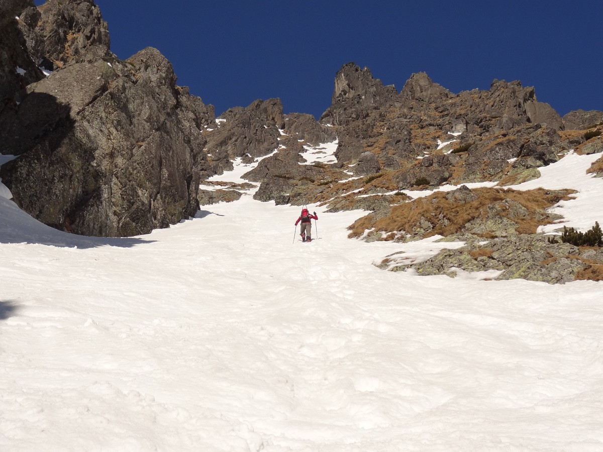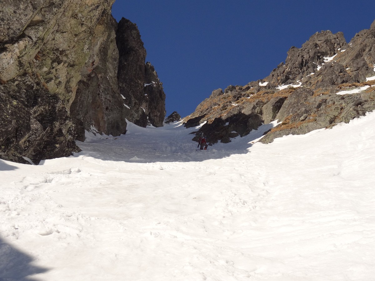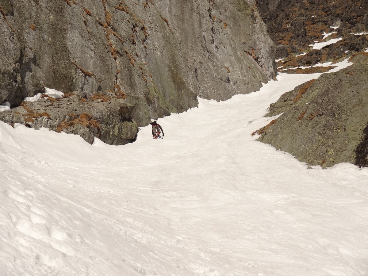 V sedle opäť na slnku, výšľap snehovou pláňou, potom jediný krátky prechod po skale do žľabu alebo skôr do série žliabkov na strane Veľkej Studenej a nimi až na vrchol. Je 10:30 a firn je už slušne nadtopený. Zhora máme dobrý prehľad na spomienky a hodnotenie absolvovaných ciest a plánovanie ďalších. Detaily zatiaľ neprezradím :)