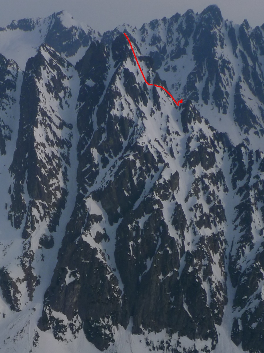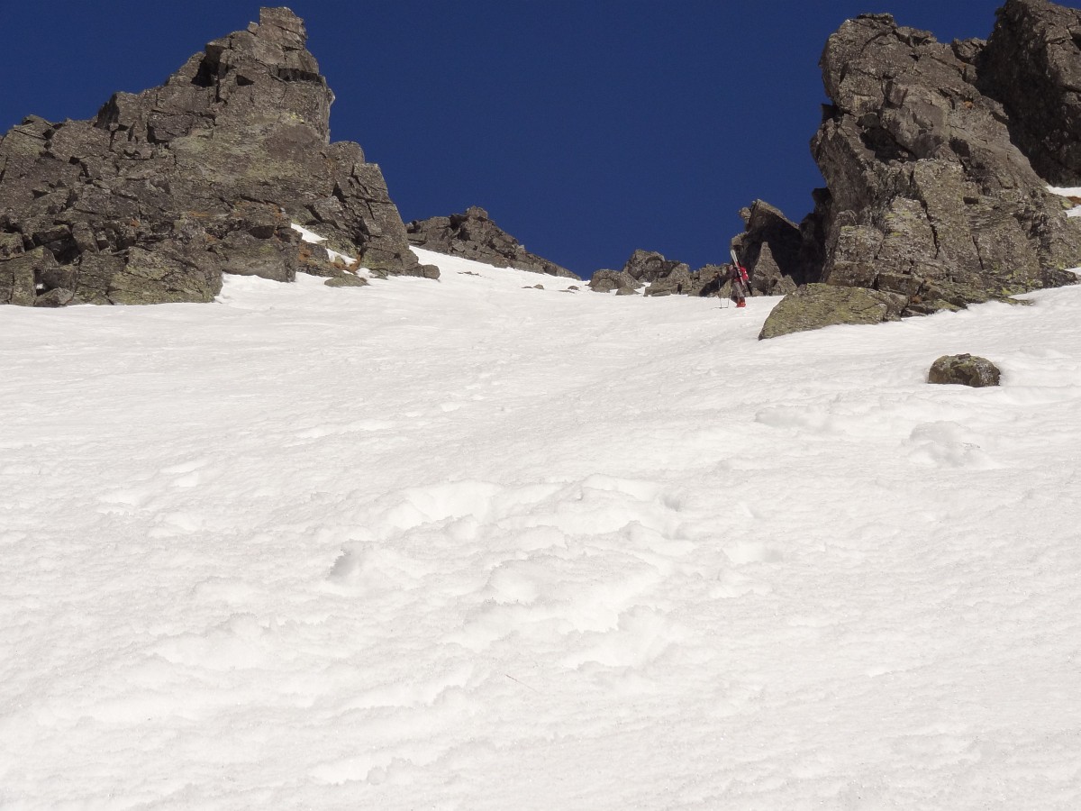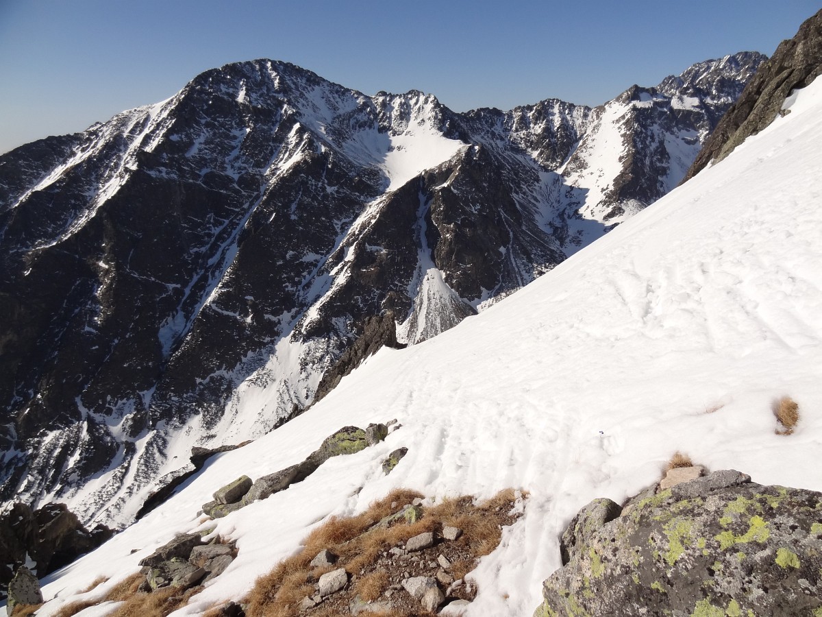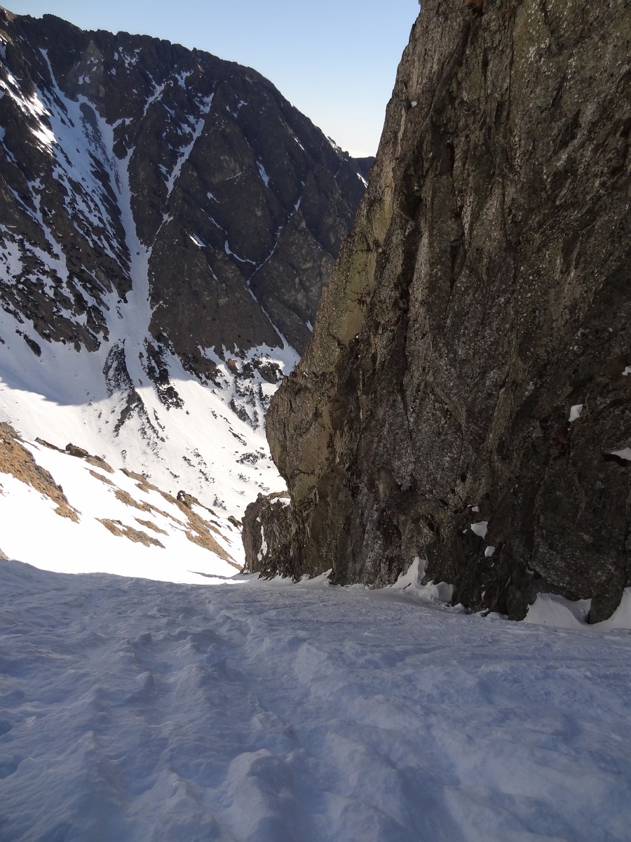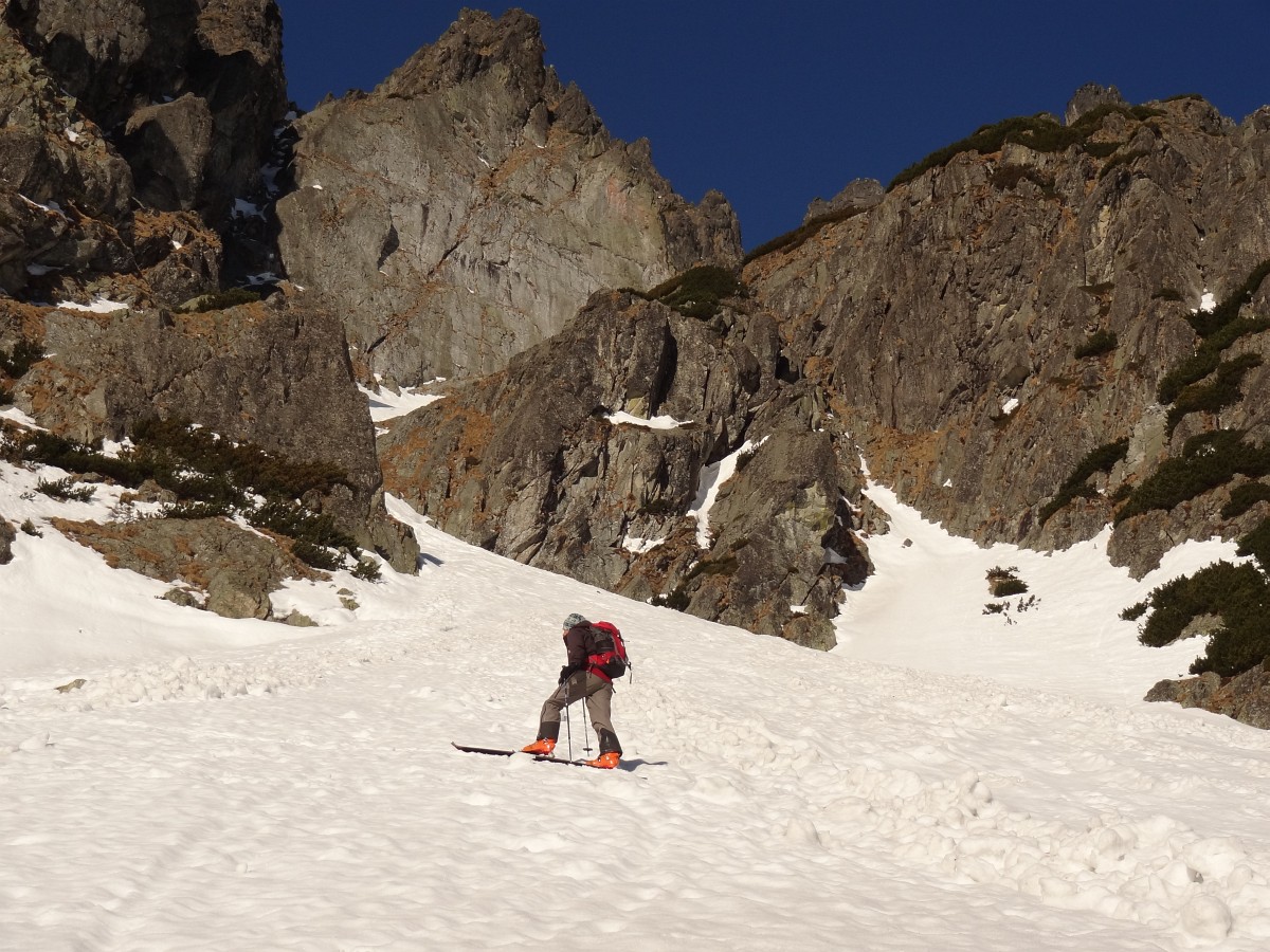 V sedle opäť na slnku, výšľap snehovou pláňou, potom jediný krátky prechod po skale do žľabu alebo skôr do série žliabkov na strane Veľkej Studenej a nimi až na vrchol. Je 10:30 a firn je už slušne nadtopený. Zhora máme dobrý prehľad na spomienky a hodnotenie absolvovaných ciest a plánovanie ďalších. Detaily zatiaľ neprezradím :)