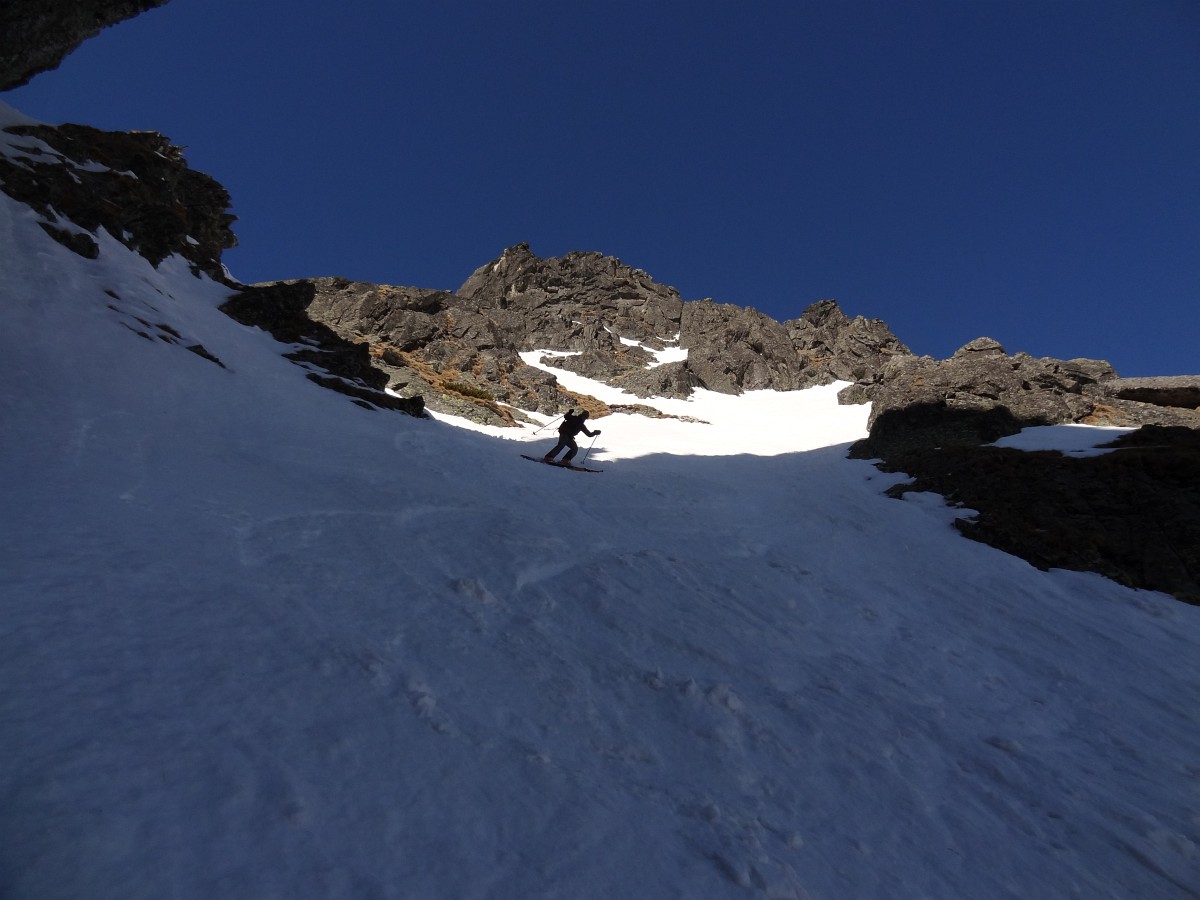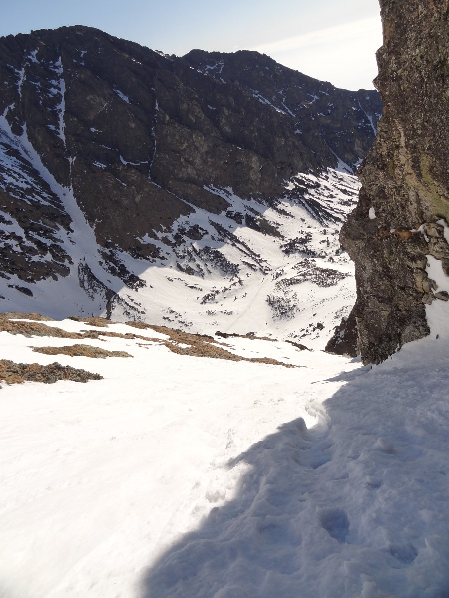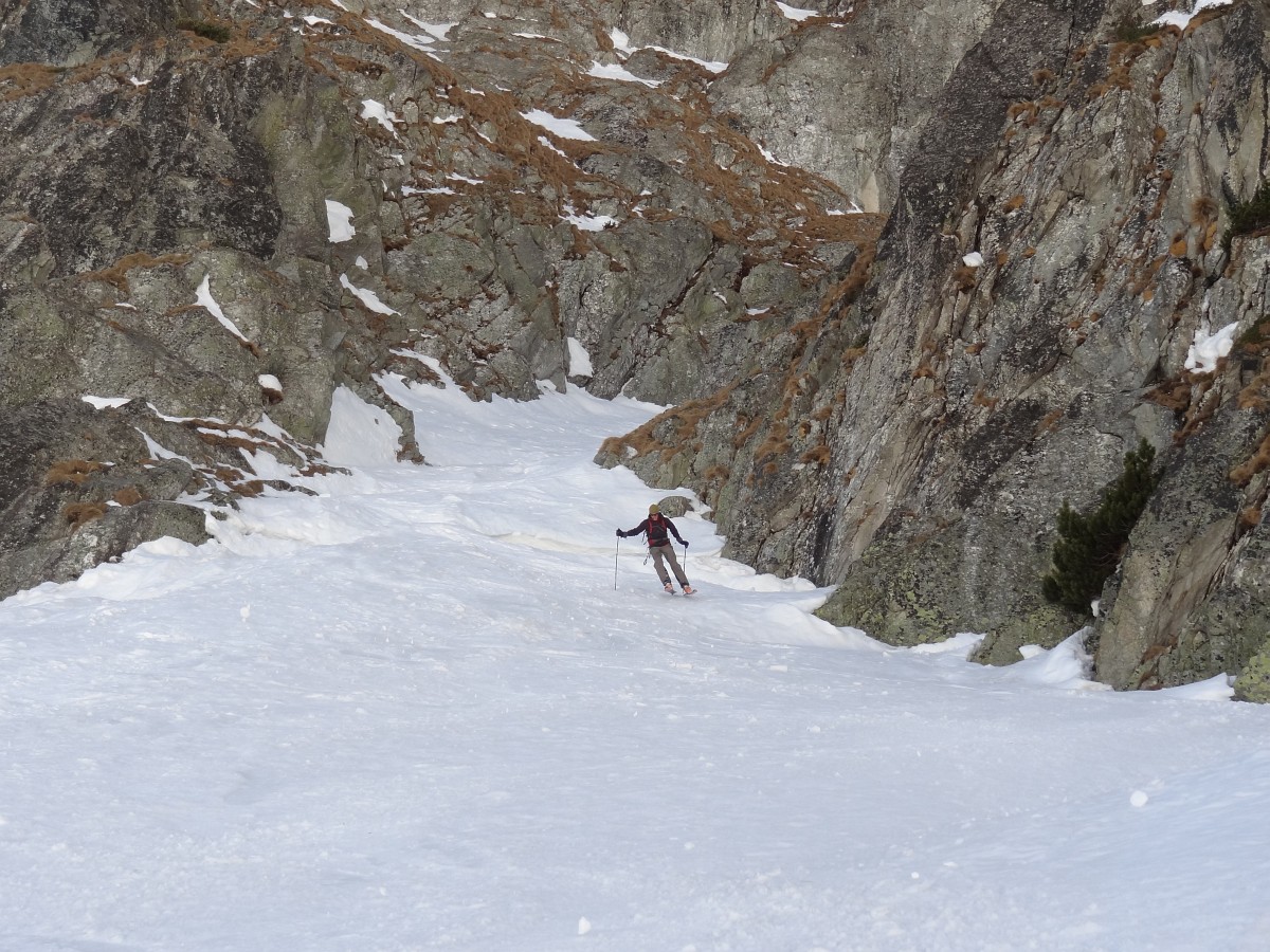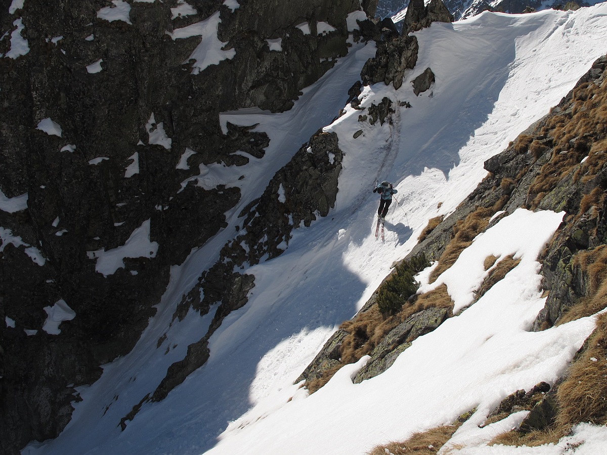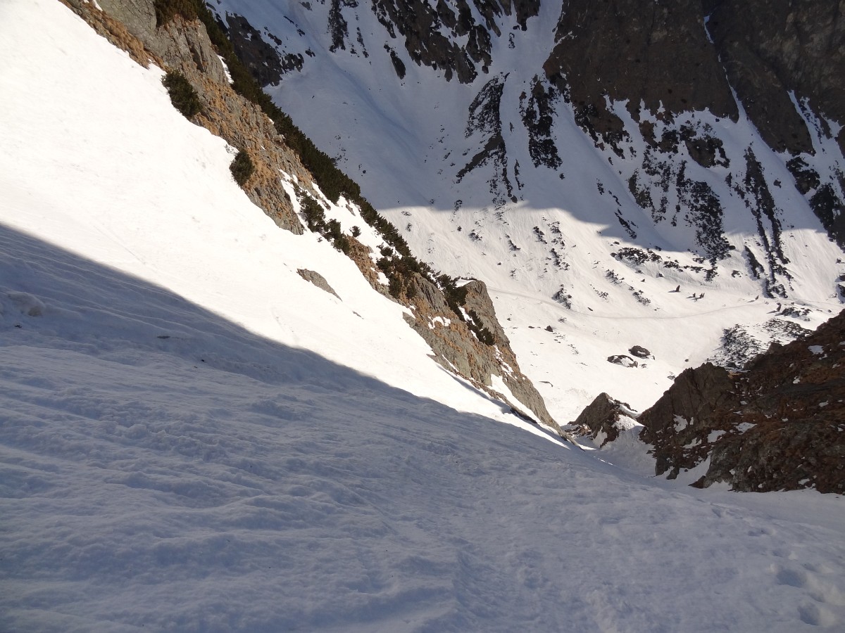 Po necelom polhodinovom vegetení začíname zjazd. Začiatok úzky, potom už jednoducho po trase výstupu až do sedla (s vyzutím v skalnatom prechode). Pod sedlom, aj keď ešte osvetleným, šikmé slnečné lúče nemajú dostatok sily udržať podklad mäkký. Morálovými oblúčikmi po tvrdom podklade vstupujeme do tieňa - snažíme sa pravým krajom tesne pri skale nájsť ešte zvyšky prašanu a vyhnúť sa rozlyžovanému stredu. Nižšie stíhame ešte z rána nadtopené úseky a záver opäť v tieni, až nás to vypľuje von zo žľabu opäť na slnko. Potom už oddychová lyžba až nad Zamku. Tam Matúš vytiahne ďalší skvelý nápad: "Traverznime na Skalnaté a môžeme zlyžovať až do Lomnice." Traverz je síce v slušnej brečke, takisto aj lyžba zjazdovkou, ale taká maličkosť už nemôže pokaziť krásne prežité nedeľné dopoludnie :)