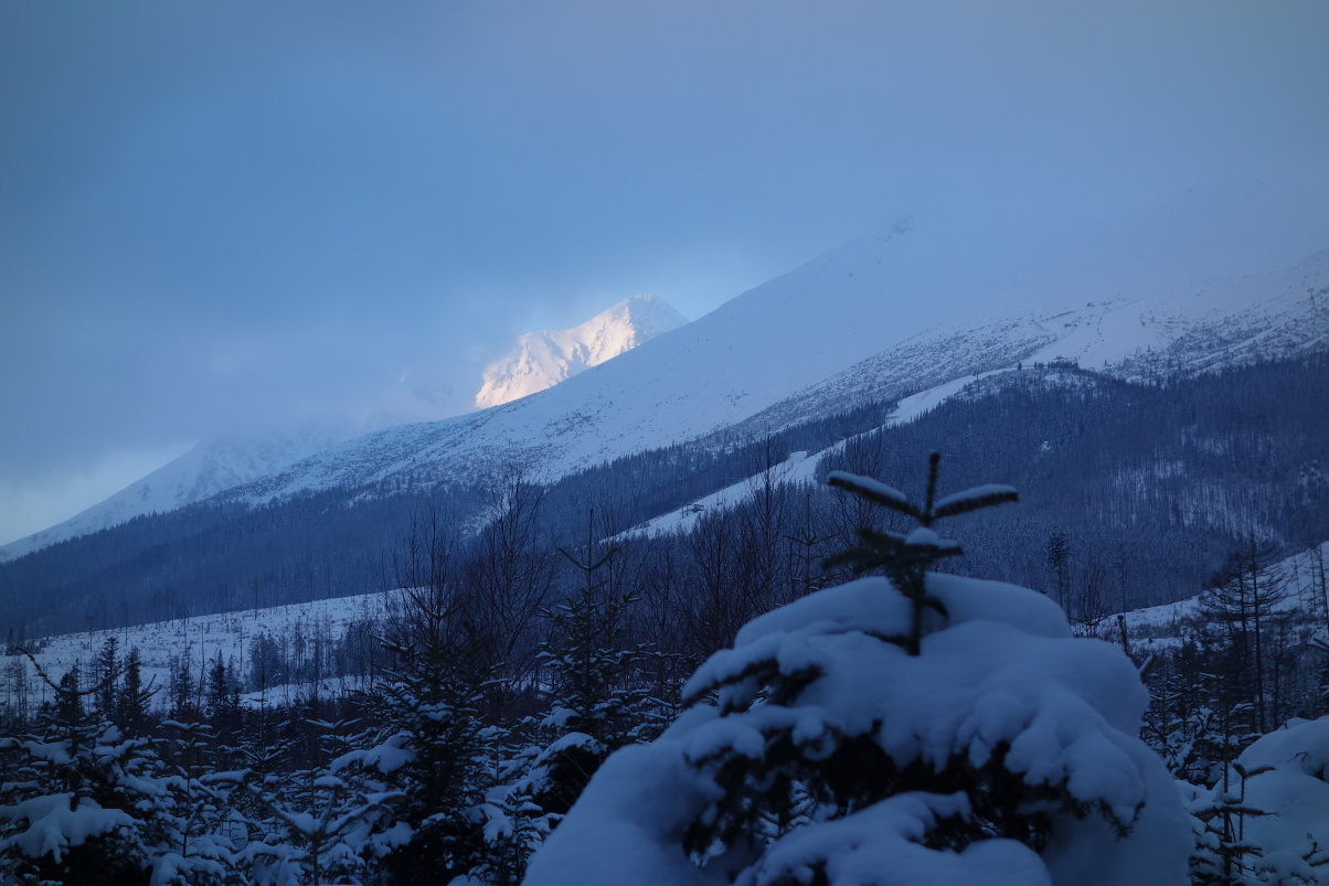 Hneď z úvodu je jasné, že Aladín zavádzal. Namiesto slnka čumíme na prevaľujúce sa mraky a tvárime sa, že ľahko neposnežuje. Aby sme nestratili morál, odhalí sa nám kus Slavkáču s pekne vysneženým Kráľovským žľabom. Fičíme smer Brnčalka, tam malá pauza. Pridelím si gulášek, ideme predsa „na ľahko“ a možnosťou teplej stravy sa nepohŕda. Vyliezame do zelenoplesého mrazu a Robokop, čo to celé vymyslel, už búši stopu smer Kopské. Na radu chatára volíme trasu cez Jeruzalem. Fučím vo vyfrézovanej stope, šlo by to aj rýchlejšie, nebyť omíňania šľachy niekde pri bedrovom kĺbe. Zrejme som si ju natiahol v rannej eufórii niekde hneď na začiatku, resp. v snahe udržať tempo s Robokopom.