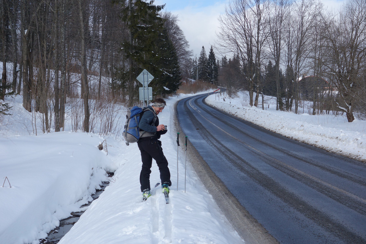 Sneh však vplyvom slnka mení kvalitu, pásy sú zrazu premočené, namŕzajú a lepia. Vypíname, škriabeme, nadávame, znova zapíname a tak párkrát dookola. Čas sa kráti. Sme na poslednej vyvýšenine s biednym názovom Biedna. Zliepame s nádejou, že gravitácia zvíťazí nad podmienkami. Nádej neumiera posledná, ale až s neuprataným vývratom, ktorý lemuje hrebeň. Prepíname na panikový mód a mixovou technikou sa predierame ďalej, až triafame kedysi zvážnicu, dnes zerodovaný rigol, ktorý zostupuje do dediny. Po úvodných patetických pokusoch o zlyžovanie berieme zúbožené lyže do rúk a bežíme dole rigolom.