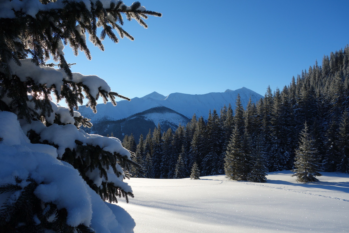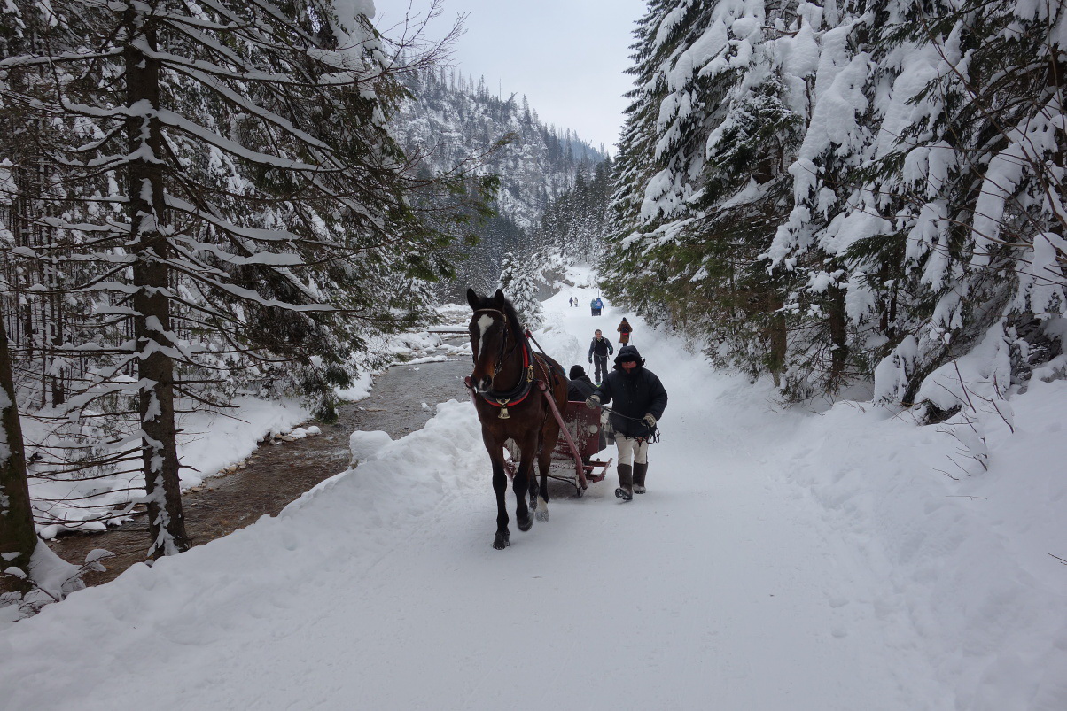 Čaká nás dlhší otvorenejší zjazd do doliny Koscieliska. Nezaobíde sa bez papuliaka - po tom, ako ma rozkýval skrytý šuter. Dolinu len prekrížime a hneď znova stúpame smer Kominiarska poľana pod rovnomenným vápencovým krásavcom. Pri nastúpavaní do neuprataného kalamitiska, ktoré sa čisto v rozpore s princípmi ochrany prírody rozvaľuje na celom úbočí našej trasy, zisťujeme, že to asi nepustí. V rýchlosti vymýšľame alternatívu. Schádzame nazad do doliny a pomedzi pešiakov a zapriahnutých koníkov, ťahajúcich sane so zababušenými rodinkami, kĺžeme k chate Ornak.