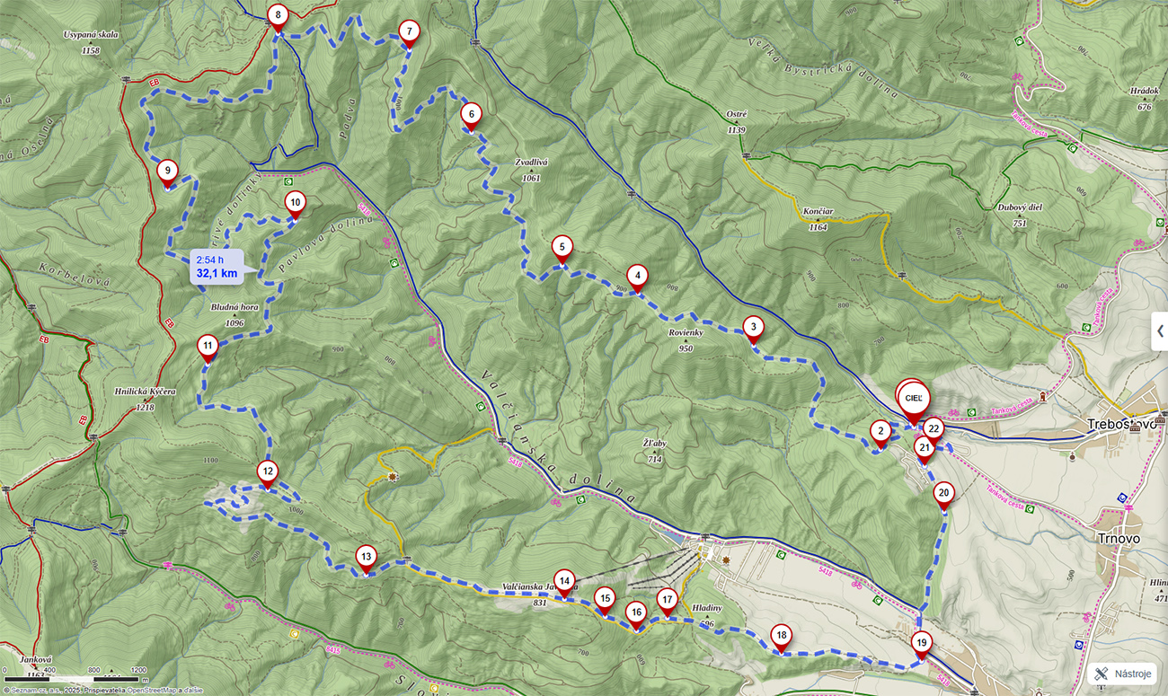 Začal som aj skončil pod „muničákom“, na konci tankovej cesty nad Trebostovom. Vystúpal som až tesne pod červenú hrebeňovku pod sedlom Maríková, pretraverzoval pod Hnilickú Kýčeru, dole som sa spustil k hornej stanici lanovky a okruh som uzavrel cez horný koniec Valče a stúpaním malou dolinou nazad k muničáku. Týmto smerom je to lepšie, lebo opačne by bol úvod v stúpaní k lanovke nezjazdný. Strmá a rozrytá cesta je to: