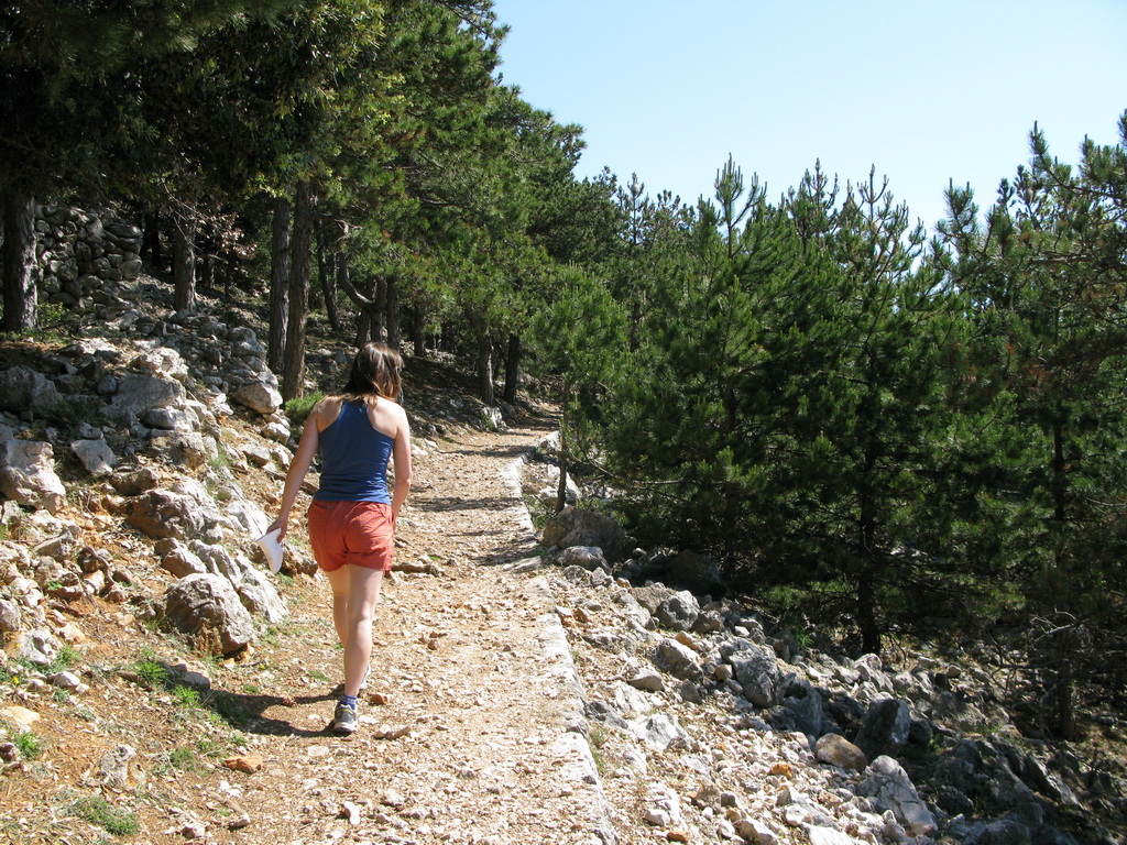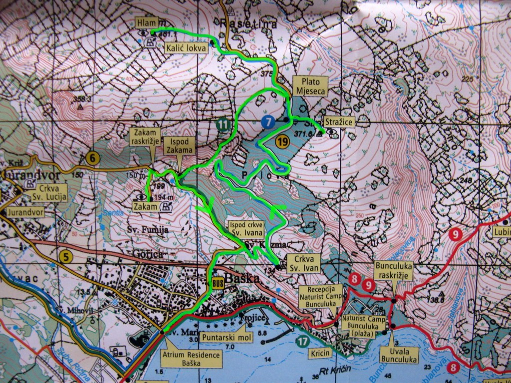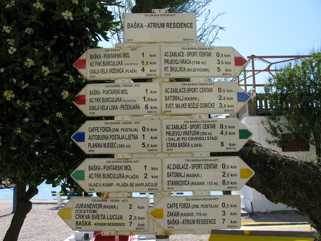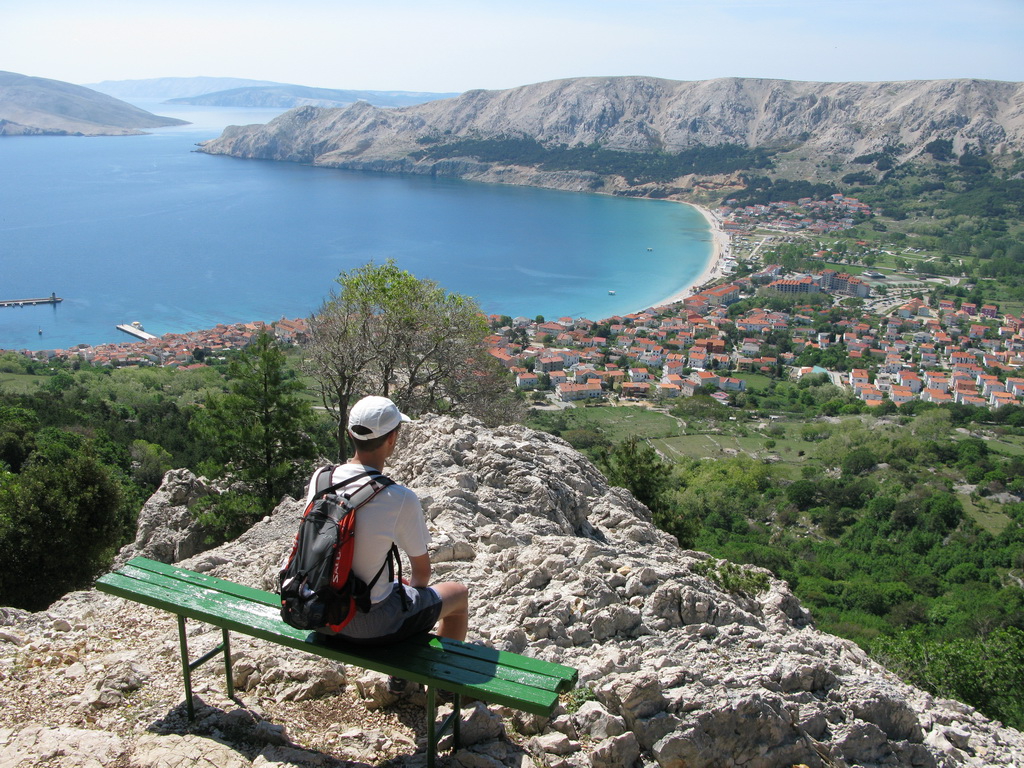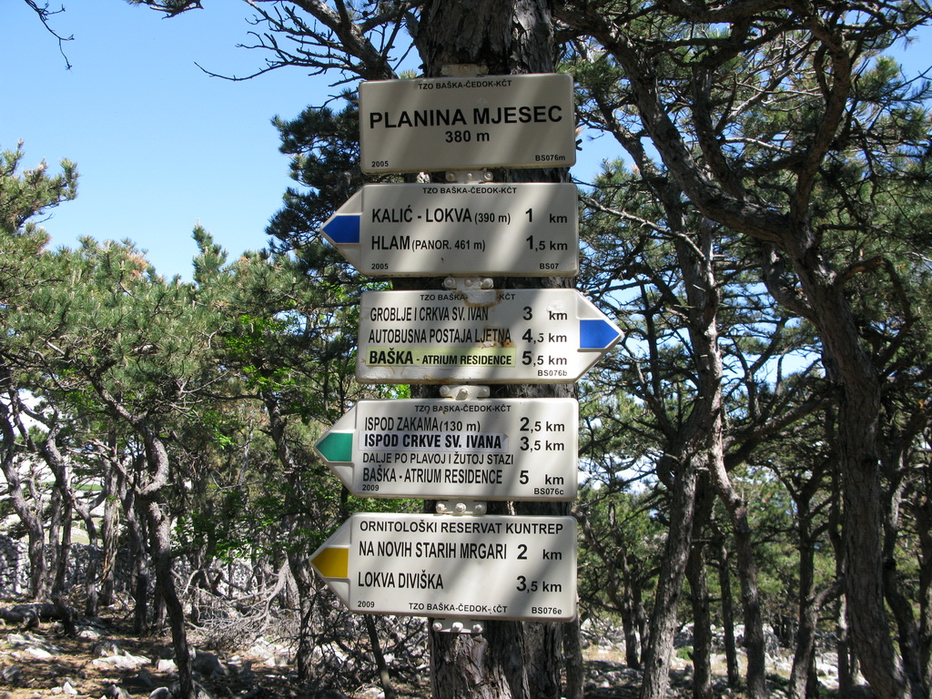 Po príchode na ostrov Krk sme sa ubytovali v kempe Zablače v stredisku Baška nachádzajúcom sa na juhovýchodnom cípe ostrova. More bolo ešte chladné a tak sme sa rozhodli pre aklimatizačnú túru. Na nábreží sme objavili rázcestník s množstvom tabuliek. Túry boli dokonca značené rôznymi farbami, čo v Chorvátsku nebýva zvykom. Až keď sme sa pozreli lepšie, zbadali sme na tabuľkách malým písmom: KČT Čedok. Tu sa nám rozjasnilo: Baška je už od predvojnových čias letoviskom so silným vplyvom našich západných susedov. Preto aj tá sieť farebných značiek. Teraz už len zostávalo zohnať mapu. Po chvíli hľadania sme našli informačku a čuduj sa svete: mapa bola zadarmo!