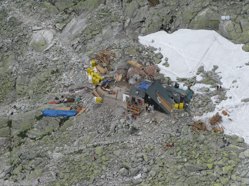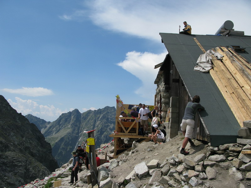 Zostup podľa mužíkov a popod Ošarpance šup-šup do Dračieho sedla. "Dnes to nebudeme preháňať, som už neviemkoľký deň po sebe v horách!" Hovorí Miki. A tak traverzujeme rýchlo na Chatu pod Rysmi. Tá je vo výstavbe, ale v bufete sa dá občerstviť. Dáme pauzu a pokecáme s personálom.