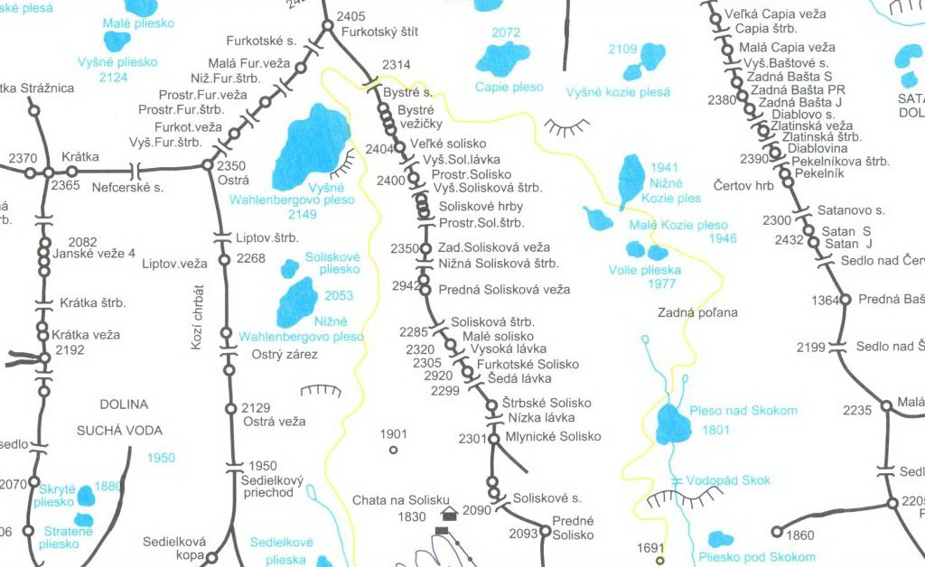 Mlynické Solisko, Štrbské Solisko, Furkotské Solisko, Malé Solisko, Predná a Zadná Solisková veža, Soliskové hrby, Prostredné Solisko, Veľké Solisko, Bystré vežičky...