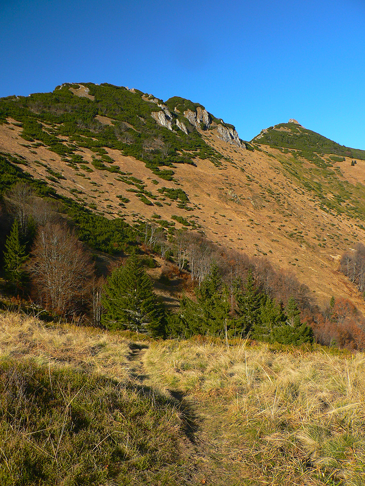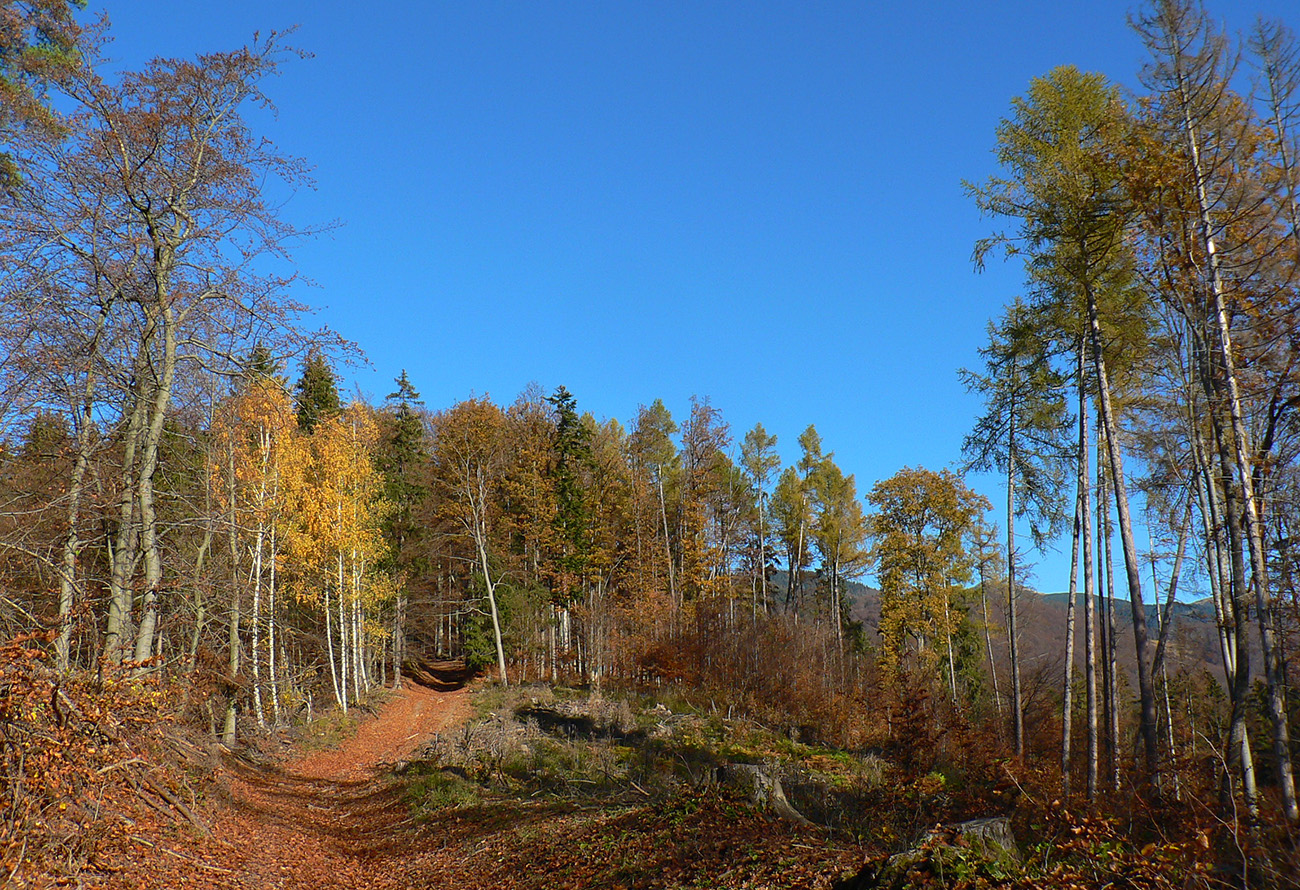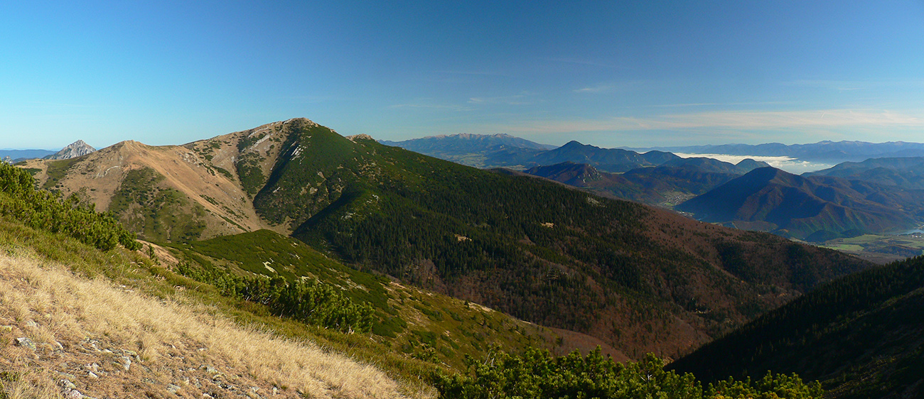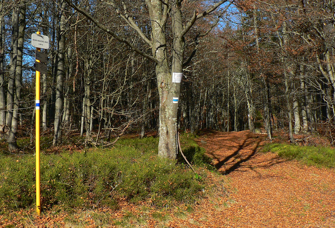 Ďalej už je to jednoduché, po modrej direkt hore. Začiatok síce hnusne lesohospodársky, aj s rúbaniskami a vymletou cestou, potom ale farebný les a nad lesom, nad Vendovkou, úúúplne iný svet. A nikde nikoho, tadeto moc ľudí nechodí, aj keď dole pár áut stálo. Inak sranda, že ani jedno z okresu :-) Čo je tu nanič, že chodník nad lesom je na jar zavretý kvôli ochrane prírody, ale biedna ceduľa s upozornením visí až na Veľkej Kráľovej. Chcem vidieť, ako sa tam niekto dotrepe spotený po vyše dvoch hodinách stúpania, prečíta, zvesí hlavu a otočí to nazad dole... Možno bolo dačo kedysi aj dole, ale taká zalaminovaná A3 dlho nevydrží, že?