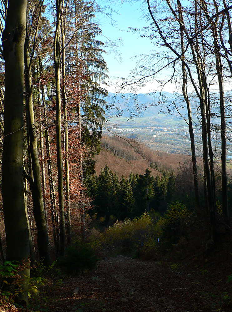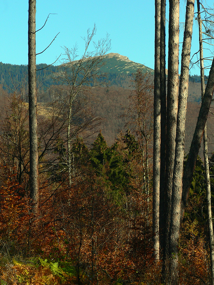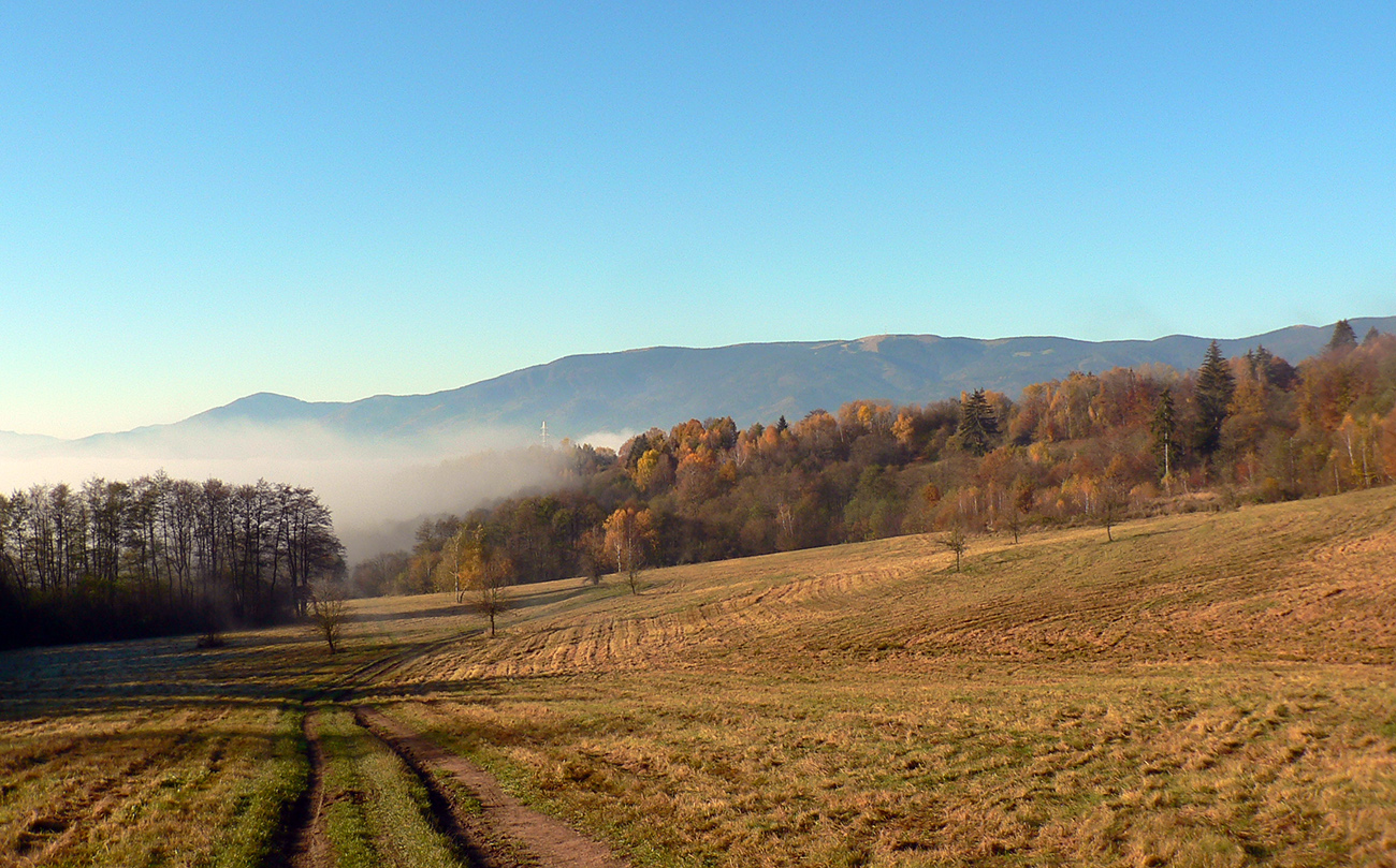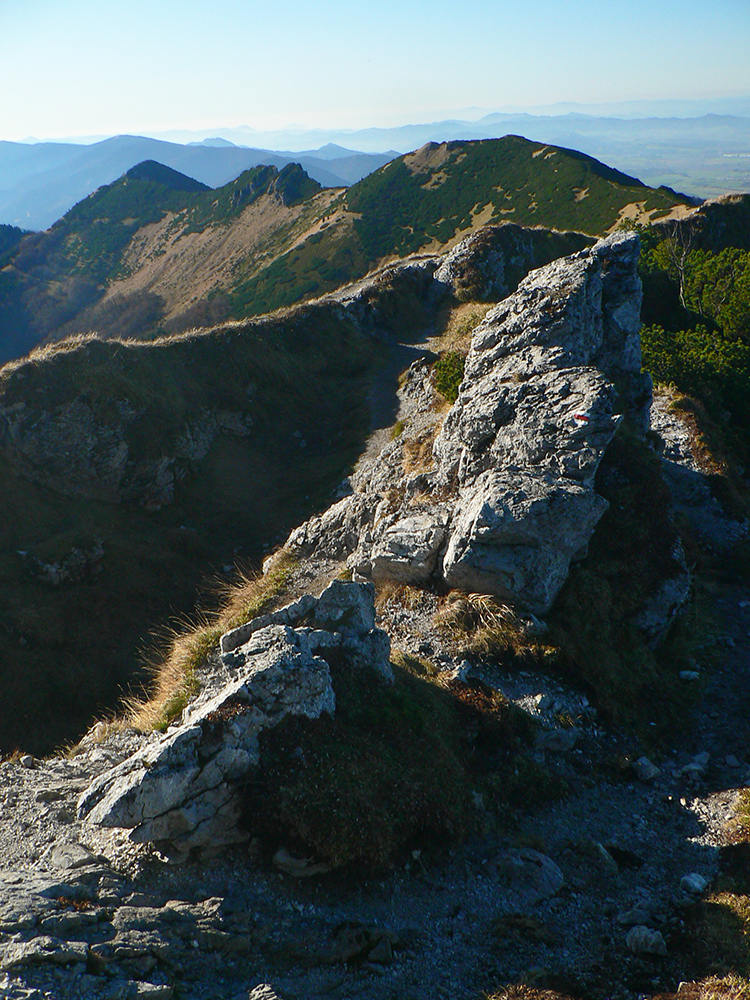 Ďalej už je to jednoduché, po modrej direkt hore. Začiatok síce hnusne lesohospodársky, aj s rúbaniskami a vymletou cestou, potom ale farebný les a nad lesom, nad Vendovkou, úúúplne iný svet. A nikde nikoho, tadeto moc ľudí nechodí, aj keď dole pár áut stálo. Inak sranda, že ani jedno z okresu :-) Čo je tu nanič, že chodník nad lesom je na jar zavretý kvôli ochrane prírody, ale biedna ceduľa s upozornením visí až na Veľkej Kráľovej. Chcem vidieť, ako sa tam niekto dotrepe spotený po vyše dvoch hodinách stúpania, prečíta, zvesí hlavu a otočí to nazad dole... Možno bolo dačo kedysi aj dole, ale taká zalaminovaná A3 dlho nevydrží, že?