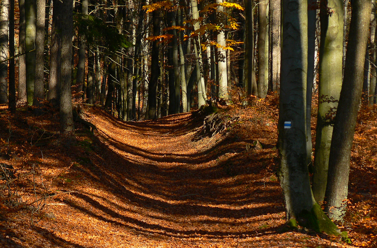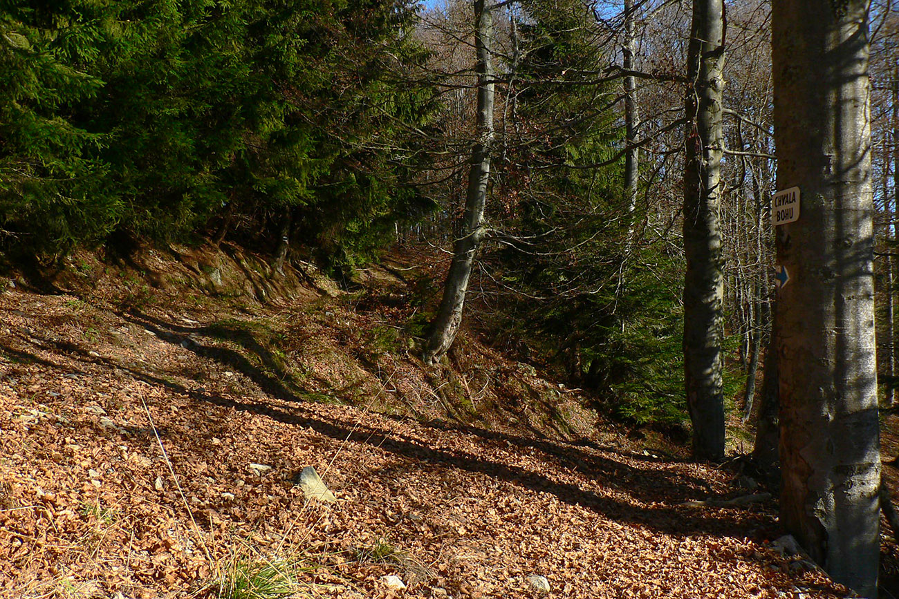 Návod na začiatok je fakt jednoduchý: kým z autobusu všetci valia po zelenej na Maguru, ja pri kostole bočím doprava a ponad cintorín ma pekná cesta vedie krovinovými tunelmi a krížom cez veľkú lúku na okraj lesa. Tam sa napájam na koniec lesnej asfaltky, po pár sto metroch sa z nej vrhám doľava a nemenej príjemnou lesnou cestou krátko stúpam ku krmelcom a dlhšie klesám v traverze na dno Sučianskej doliny. Potom ešte chvíľu dole dolinou a už som pri chatovej osade Jarolím, pri smerovníku modrej značky. Trafí každý, mapka je aj v galérii:
