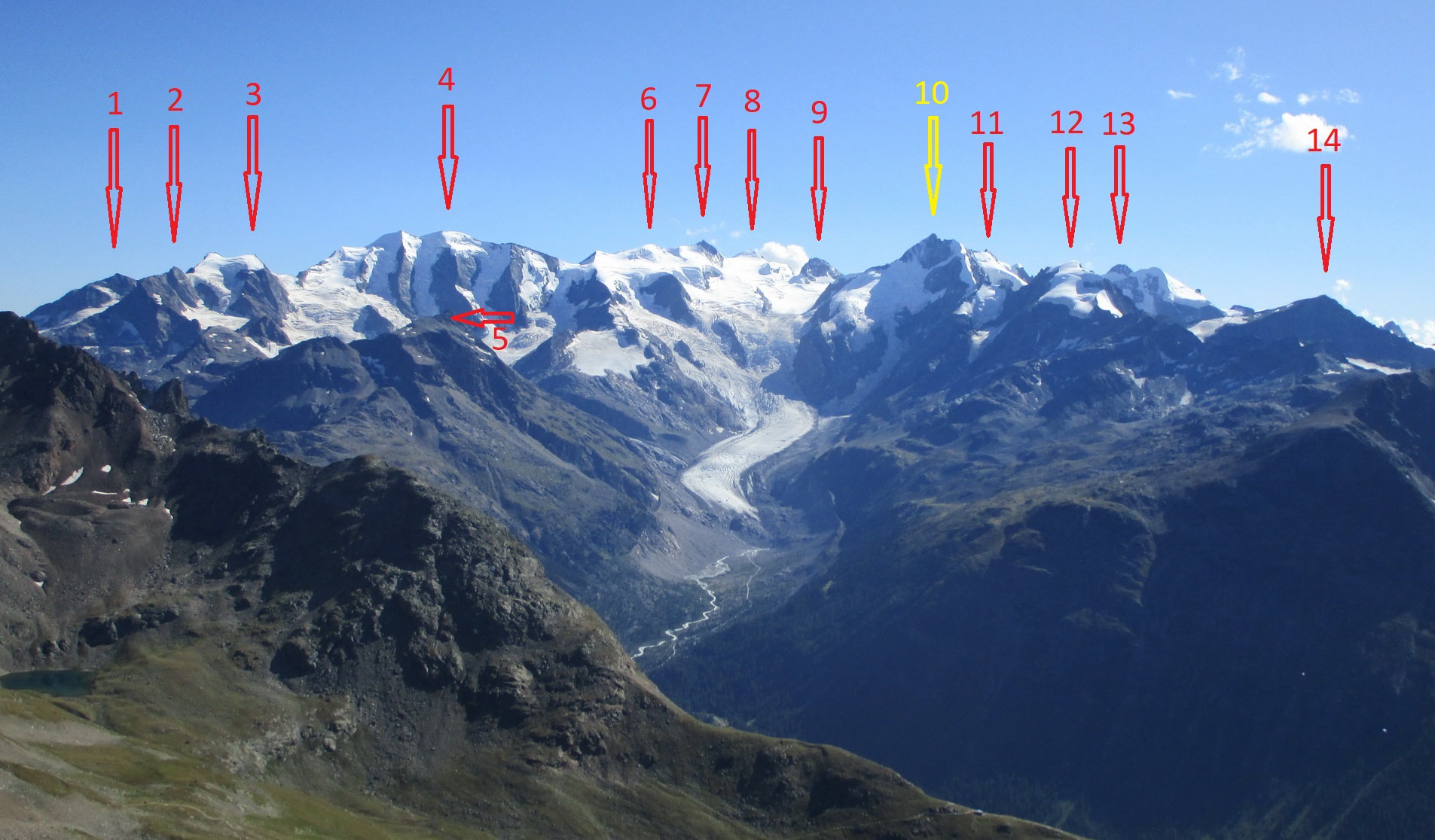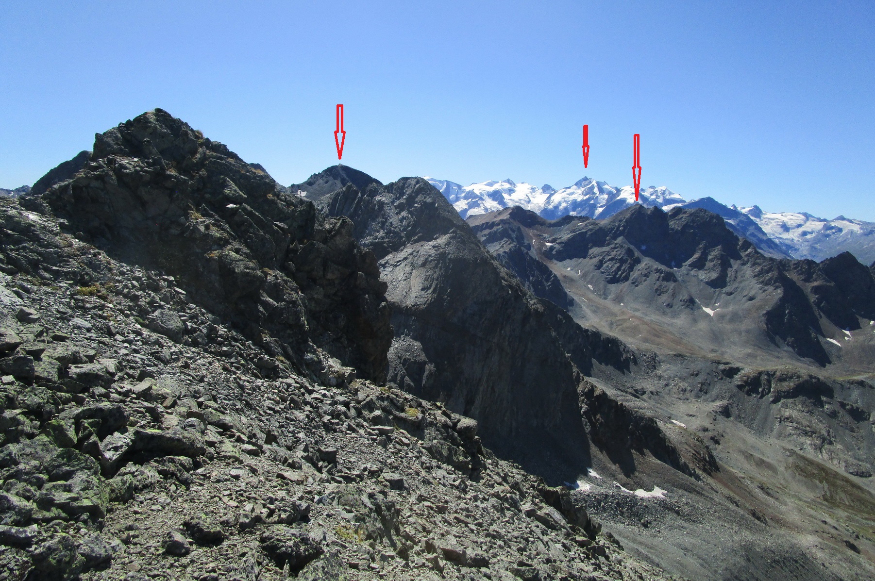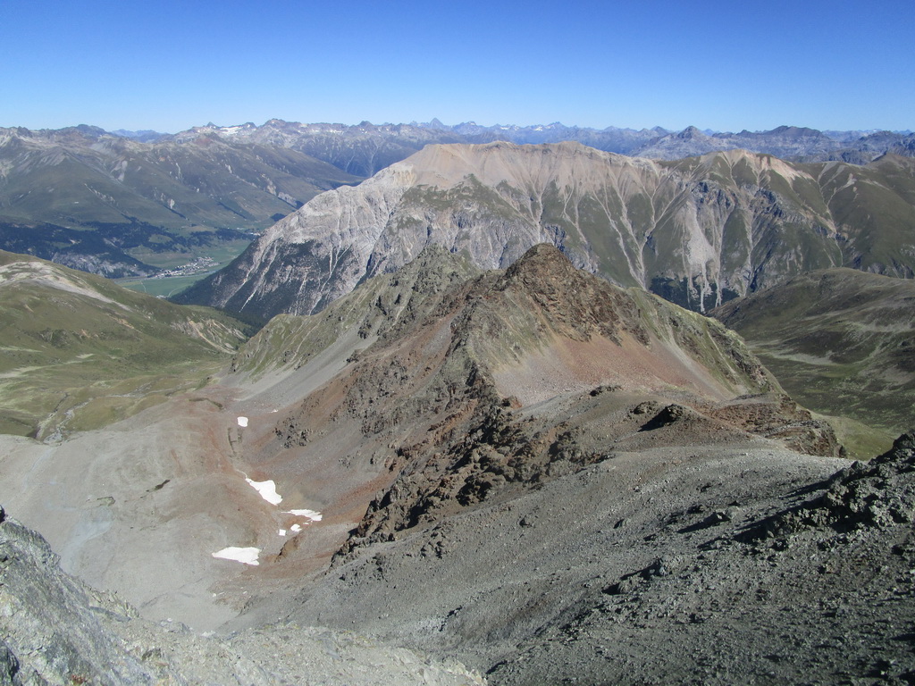 Obehnem zopár postarších Švajčiarov, vypočujem si nejaké tie závistlivé poznámky a potom sa znovu ocitám v teréne mimo značiek a mimo ľudí. Vo Fuorcla Muragl schádzam zo značky a hrebeňom si to namierim na Piz Clux. Terén ma celkom púšťa, postupujem rýchlo a o chvíľu si už fotím výhľady z vrcholu. Odtiaľto ma čaká hrebeň na Piz Muragl. Opäť sa zadarilo aj keď trebalo aj popoliezať a z Muraglu sa teším super výhľadom. Na tomto kopci som už bol aj dvakrát v zime. Je známy svojími úžasnými výhľadmi na Berninské Alpy.