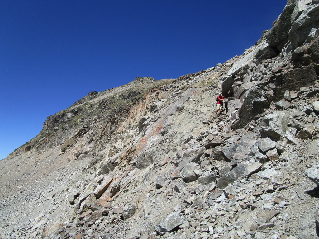 Výstup do Fuorcla Burdun je celkom zaujímavý. Ľahké lezenie, voľné kamene. Je mi jasné, že dole to tadiaľto nepôjde. Aj preto v sedle venujem dostatok času na prieskum terénu v prípade môjho návratu týmto smerom.