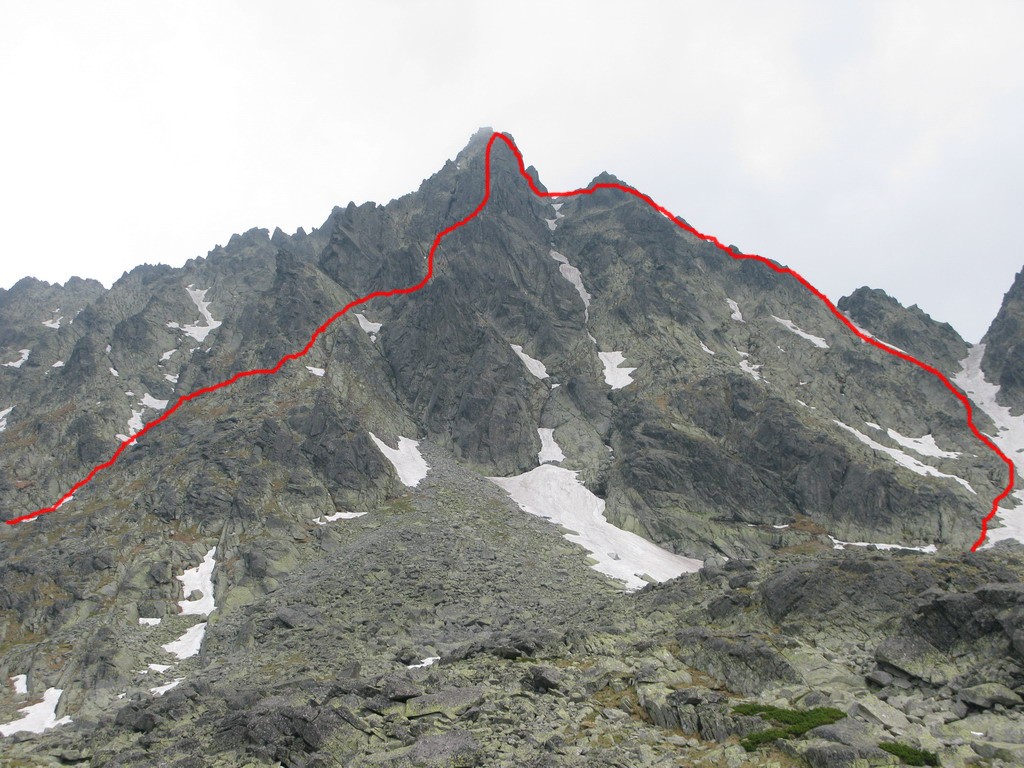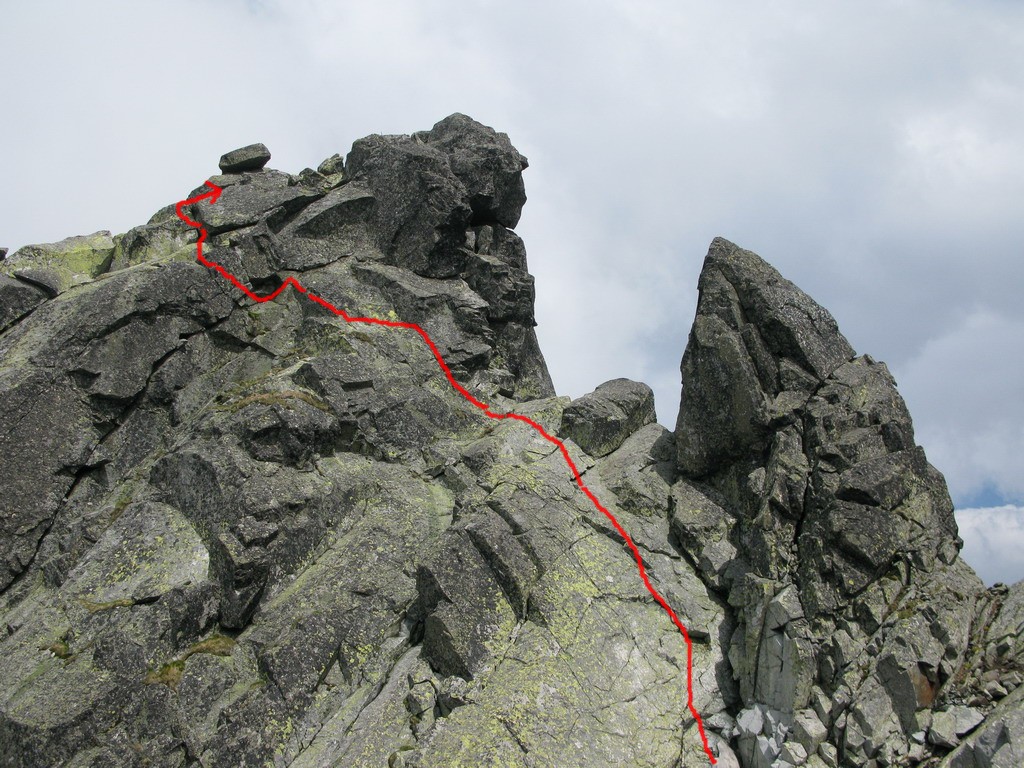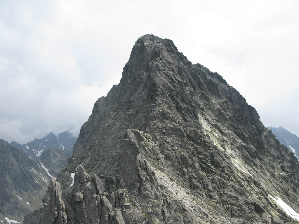 Pri Rumanových plieskach si ujasním ďalší plán: prejsť cez Kohútik, potom sa uvidí. Po ceste ale ešte odskakujem na Ťažký štít (Český). Stále neprší, len občas zaduní. Z Ťažkého štítu mám vrchol Rysov ako na dlani. Vidím vystupovať pár turistov. Ďalší cieľ je jasný. Najprv však musím prejsť cez Kohútik. Reťaze sú zčasti pod snehom, sedačku mám stále na sebe a tak neváham a rýchlo vyťahujem lano. Po šťavnatom traverze snehovým poľom mi už nič nestojí v ceste. Kúsok nad Váhou nechávam batoh pri železnej tyči a ďalej idem už len s foťákom - ako japonský turista.